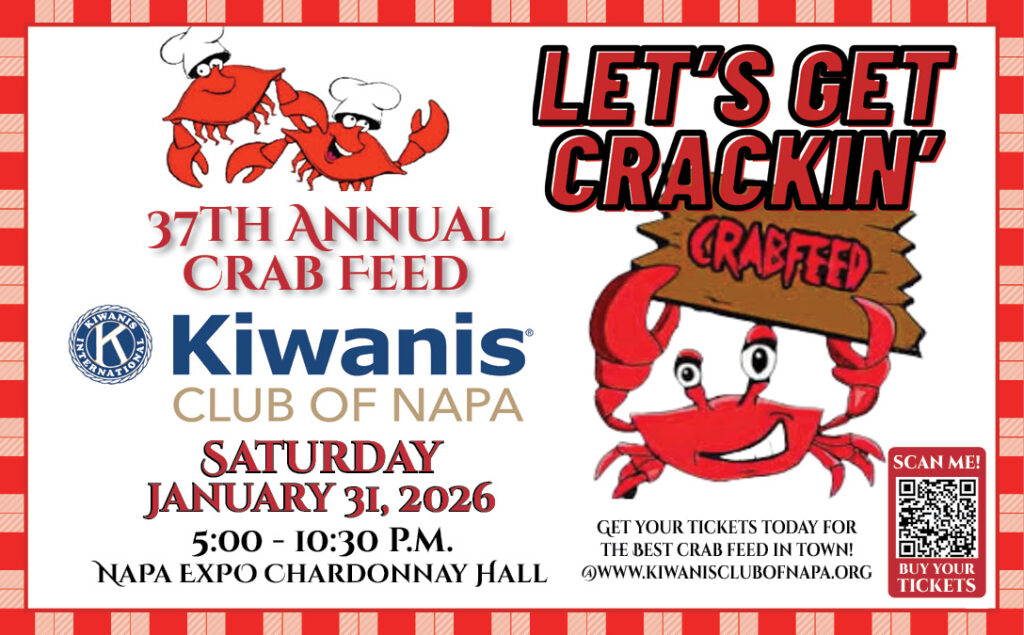 The Kiwanis Club of Napa is excited for the 37th Annual Kiwanis Club of Napa Crab Feed on Saturday, January 31, 2026 at Chardonnay Hall located in Napa Valley Expo.